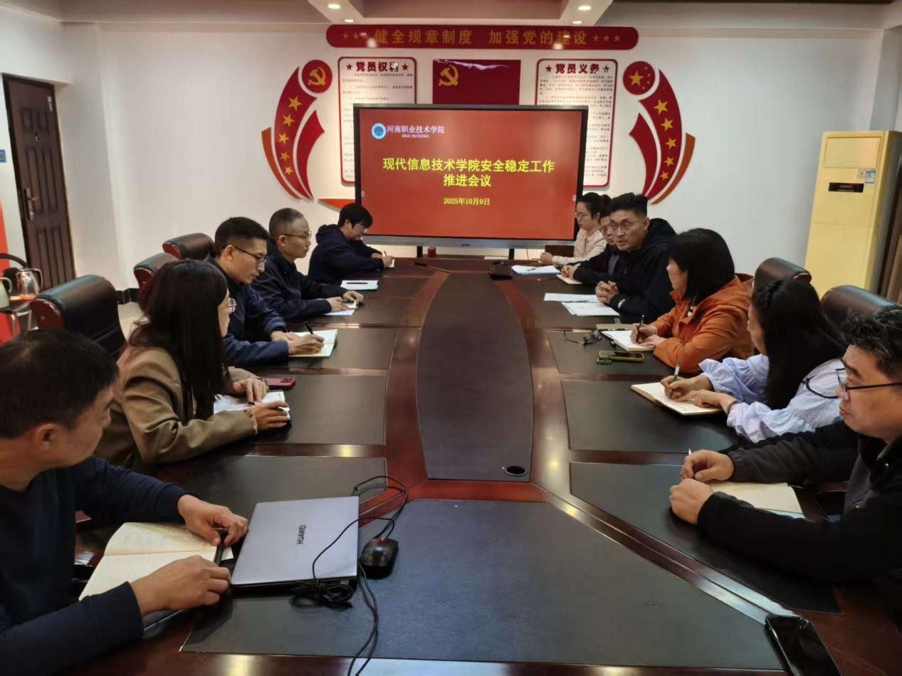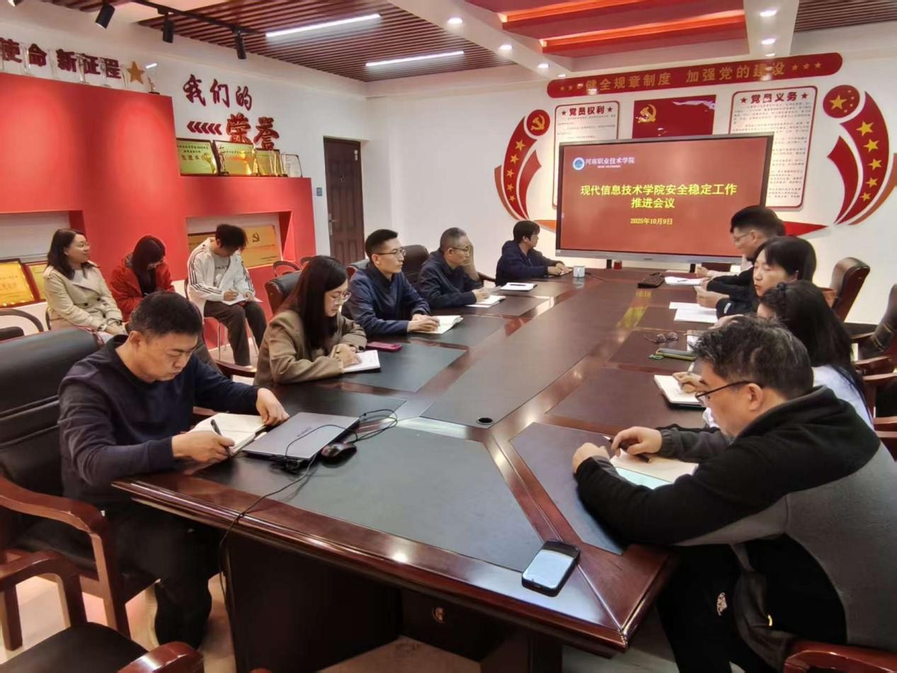 为进一步筑牢校园安全防线,压实安全工作责任,10月9日,现代信息技术学院在笃行楼508会议室召开安全稳定工作推进会议。学院党总支书记兼院长李纪云、副院长赵大鹏,以及学院各部门负责人共同参会,会议围绕校园安全与意识形态工作重点展开部署。