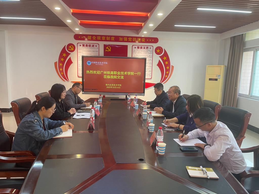 刘雨涛对我院在党建引领高质量发展、实训教学改革、毕业生就业质量提升等方面取得的突出成绩给予了高度评价,并结合广州铁路职业技术学院人工智能学院的办学实际,分享了其在产教协同育人、校企合作机制创新等方面的宝贵经验。随后,双方围绕“双高计划”背景下专业群建设、课程体系、人才培养模式、实习实训管理机制、毕业生高质量就业路径以及技能竞赛培育等核心议题,展开了坦诚深入的交流与研讨。