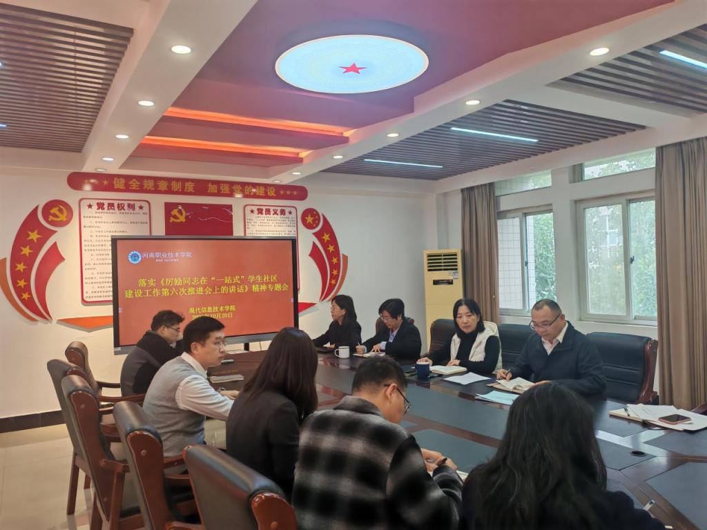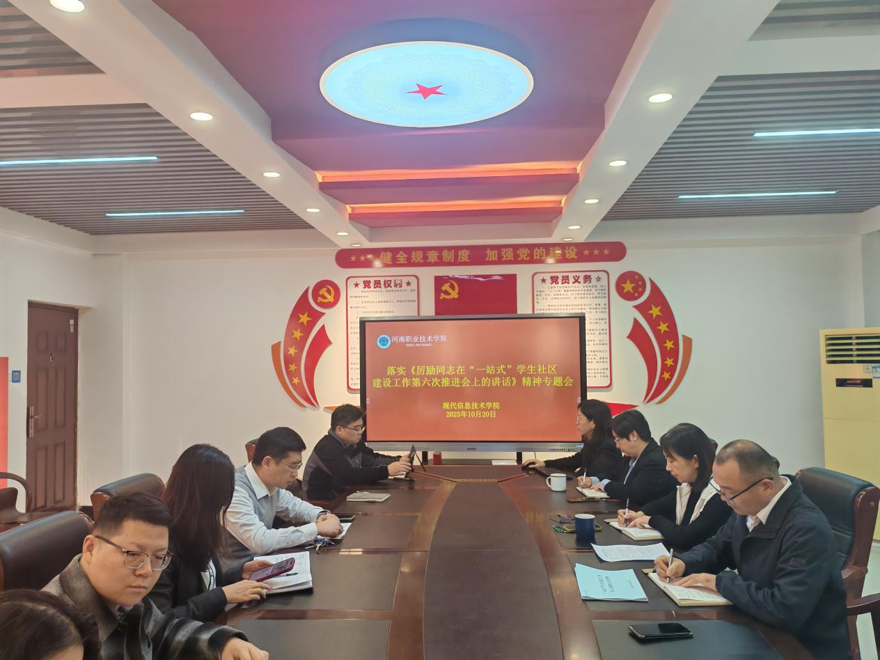 为深入贯彻落实校领导在学校“一站式”学生社区建设工作第六次推进会上的讲话精神,10月20日下午,现代信息技术学院在笃行楼508会议室召开专题会,学院领导班子成员及各教研室主任参会,会议由副院长董俊磊主持。