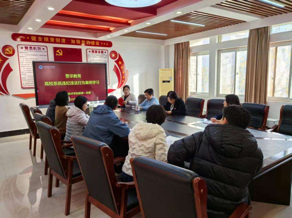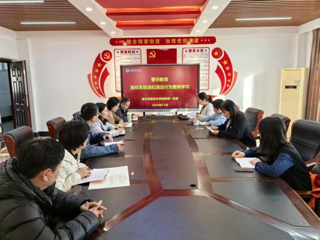 11月20日下午,现代信息技术学院教师第一党支部在笃行楼508会议室组织开展高校系统违纪违法行为警示教育活动。活动由党支部书记翟慧主持,学院党总支书记、院长李纪云担任领学人,支部全体党员参加。