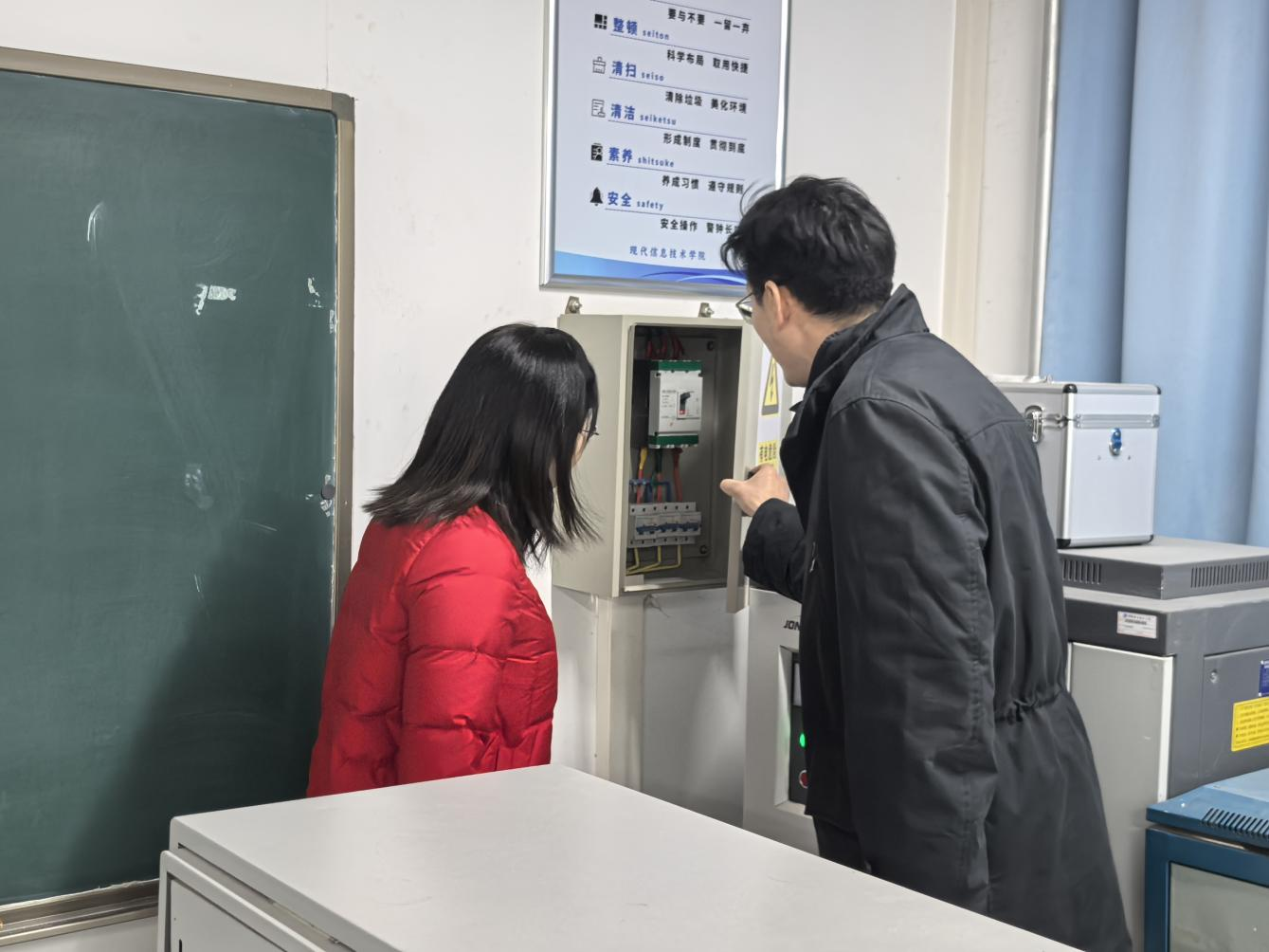 12月31日下午,在元旦假期来临之际,为全面排查安全隐患,切实保障校园安全稳定,现代信息技术学院院长兼党总支书记李纪云、副院长赵大鹏带队,对学院所属的办公室、实训中心等重点区域进行了全面、细致的节前安全大检查。