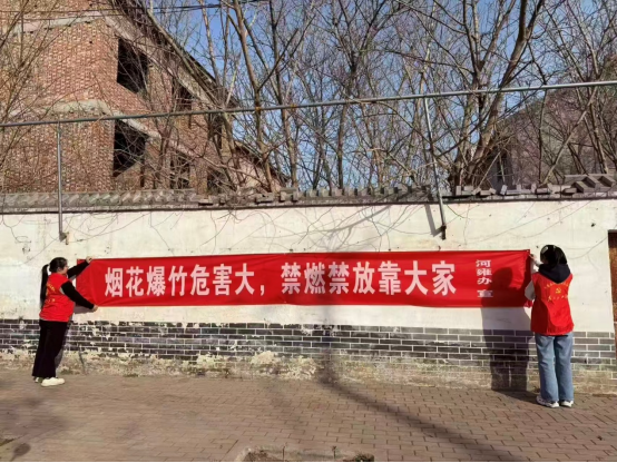 大数据 242 班王晴晴同学在河雍街道小宋庄村及周边商圈,以“沉浸式 + 互动式 + 精准化”的方式开展禁燃禁放宣传活动:在乡村悬挂横幅,用乡音入户宣讲政策;在商圈进行流动宣传,向商户和群众做场景化解读;入户拉家常,发放 50 余份宣传页,解析禁放范围、后果及替代方案。活动覆盖超 100 人次,悬挂横幅 2 条,提升了居民对政策的认知与配合度,展现了新时代共青团员扎根乡土的使命自觉,彰显了大数据专业青年运用技术思维服务社会治理的担当。