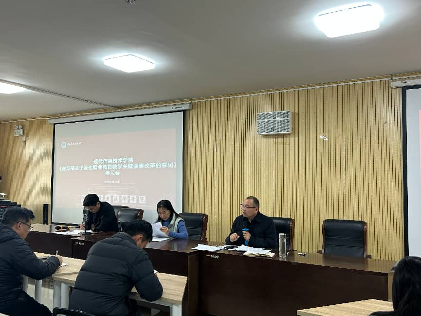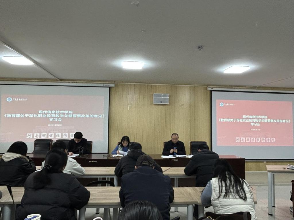 为深入贯彻职业教育教学改革精神,精准把握新时代职业教育发展方向,2月27日,现代信息技术学院在笃行楼525会议室召开全体教师会议,学习《教育部关于深化职业教育教学关键要素改革的意见》。学院院长李纪云、副院长董俊磊、赵大鹏出席会议。