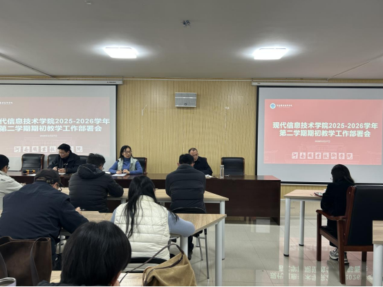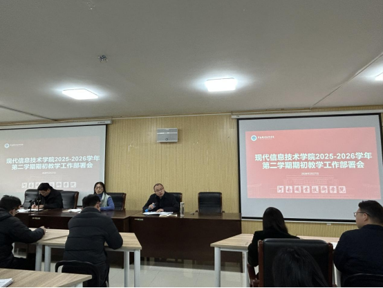 为深入贯彻学校新学期教学工作部署,全面落实教学检查与开学教学准备各项要求,规范教学运行、提升育人质量,2月27日下午,现代信息技术学院在笃行楼525会议室召开新学期教学工作会议。全体教职工参会,会议由院长李纪云主持。