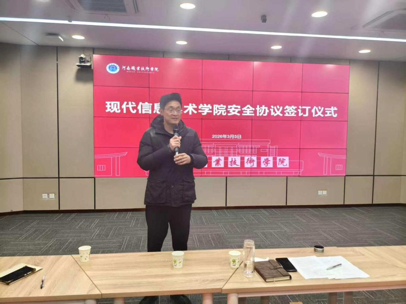 为全面贯彻落实学校“四级联动安全管理责任体系”的要求,切实压紧压实安全责任,3月5日下午,现代信息技术学院于明知3110会议室举行2026年安全目标管理责任书签订仪式。学院院长兼党总支书记李纪云、领导班子成员及全院教职工共同参与了此次会议。