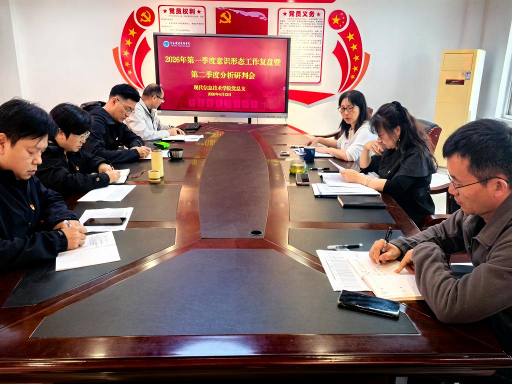 为深入贯彻落实党的二十届四中全会精神,全面总结2026年第一季度意识形态工作成效,科学研判第二季度意识形态领域风险挑战,进一步筑牢意识形态安全防线,4月13日,现代信息技术学院在笃行楼508会议室召开第一季度意识形态工作复盘暨第二季度分析研判会。学院党总支书记、院长李纪云,其他领导班子成员出席会议,党支部书记、辅导员代表参加会议。会议由党总支副书记童俊艳主持。